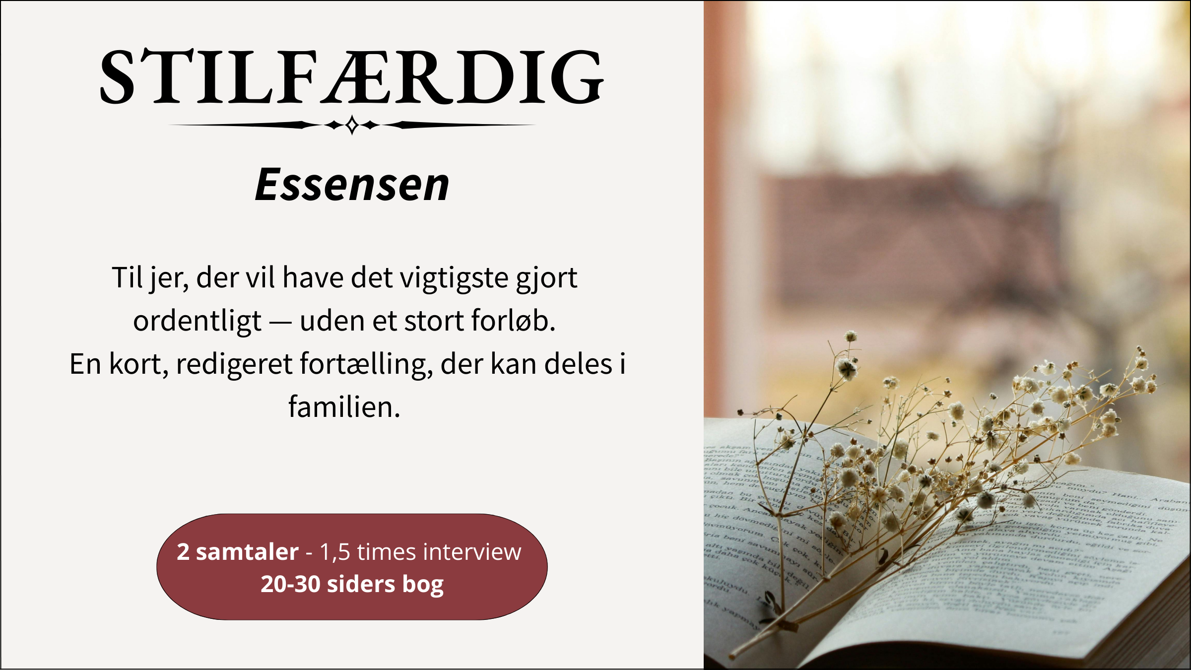 Eftermælet hjælper efterladte – og personer i god tid – med at samle de skrøbelige minder, der ellers ligger spredt: i telefoner, flyttekasser og skuffer. For når historier ikke bliver fortalt, forsvinder detaljerne først — og til sidst bliver et helt liv til brudstykker. Vi gør det til et mindested i hjemmet: livshistorien fortalt ordentligt, og plads til de små ting, man ikke nænner at smide ud. Et konkret sted at gå hen med savnet — tæt på i hverdagen — så fællesskabet om den, I har mistet, ikke kun lever på kirkegården. Historien bliver til gennem professionelle samtaler og journalistisk håndværk. Mindestedet kan åbnes igen og igen, og fortællingen kan blive i familien og gå i arv.