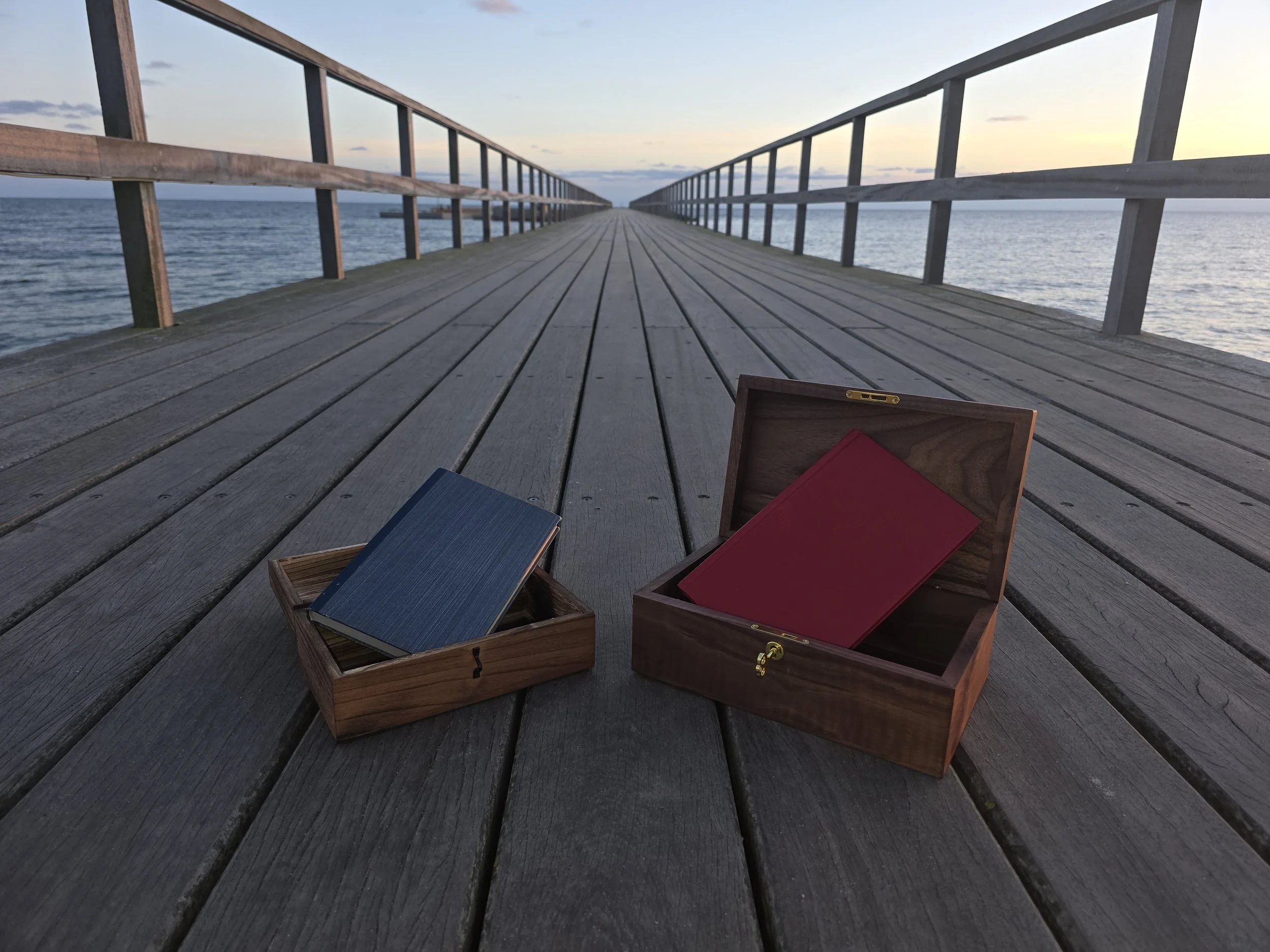 En trææske, der giver historien en fast plads i hjemmet – og gør det muligt at skabe jeres eget mindested. Her kan portrætbogen ligge sammen med de små ting, man ikke vil miste (fx et foto, et brev, en ring eller andre minder), så det hele kan tages frem igen – roligt og samlet.