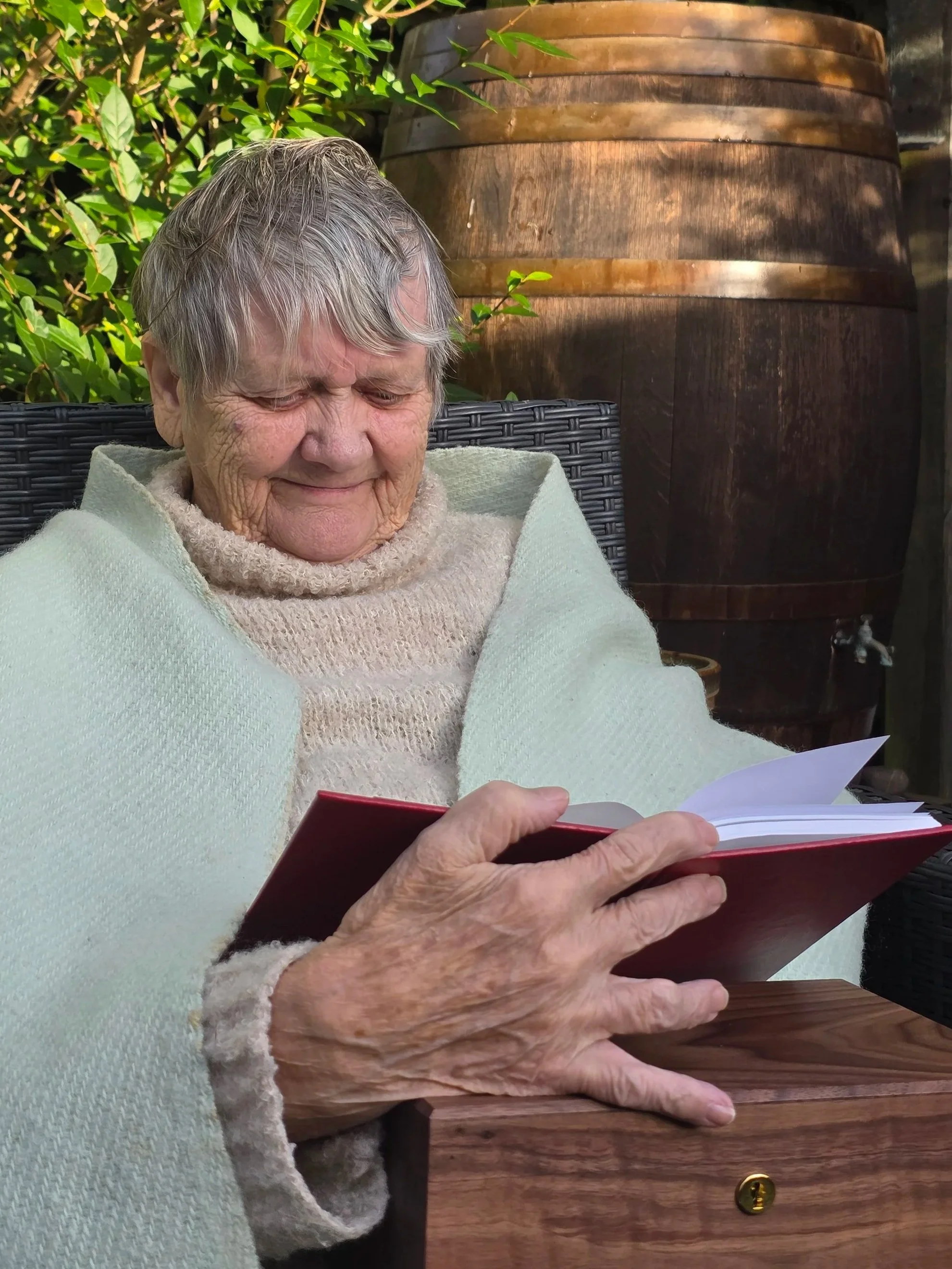 Her samler vi livshistorien i en hardcover portrætbog og lægger den i en trææske. Ikke for pyntens skyld, men fordi det gør mindet mere tilgængeligt: når savnet rammer, når familien samles, eller når nogen spørger: “Hvem var hun egentlig?”