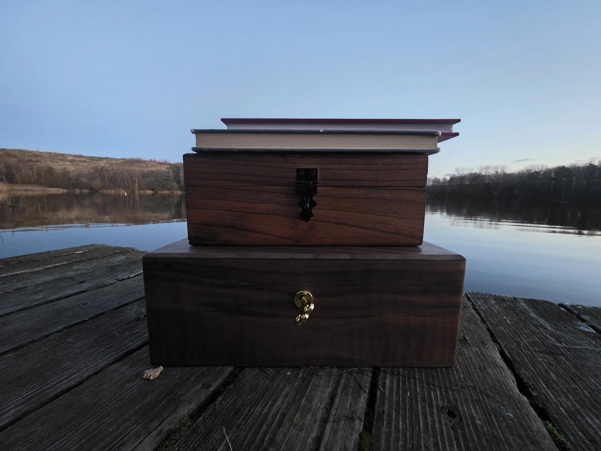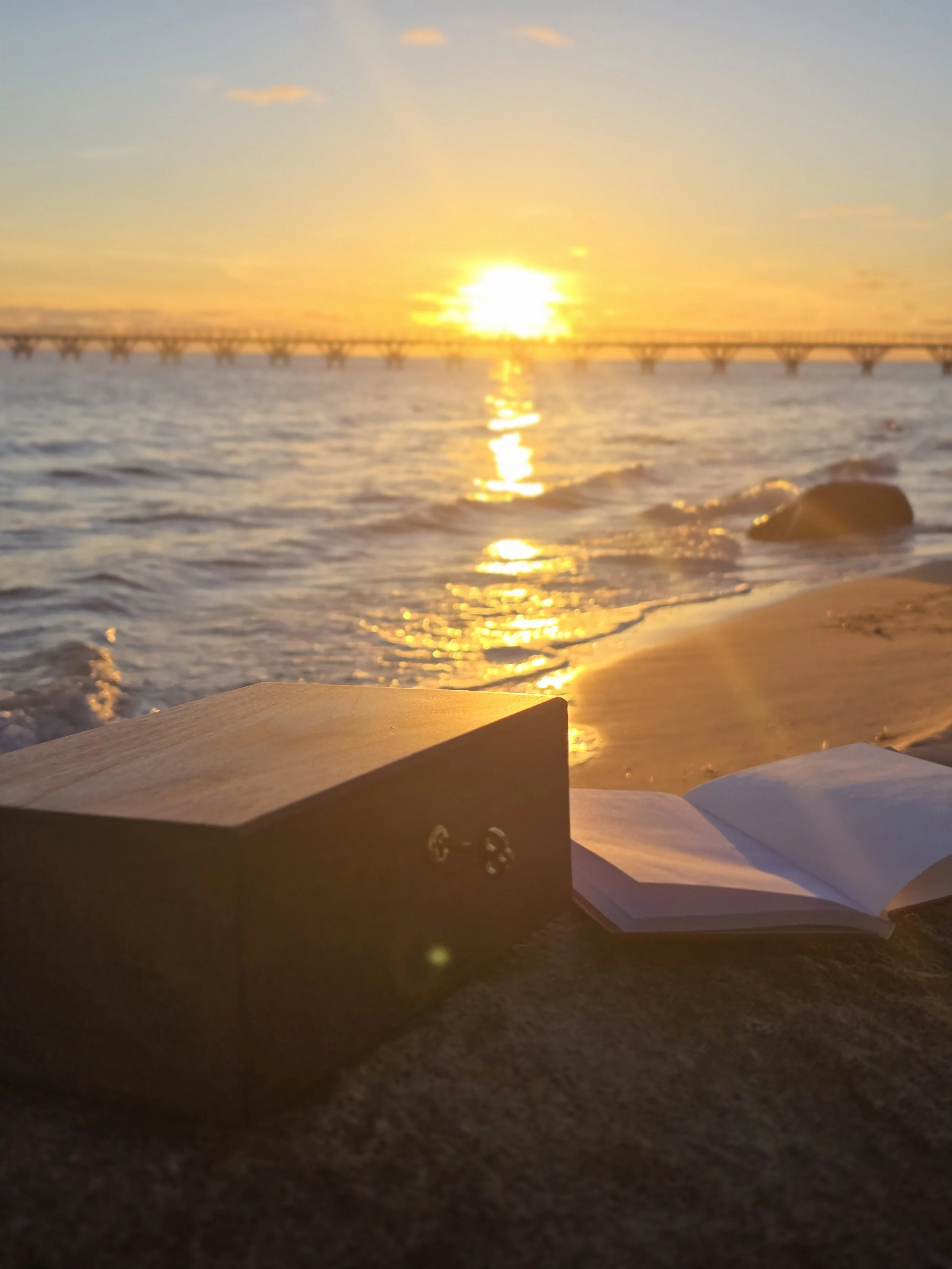 Bogen trykkes i bogbinderkvalitet og lægges i den valgte mindeæske af massivt træ. I får det færdige sæt hjem – klar til at blive taget frem, delt og givet videre.